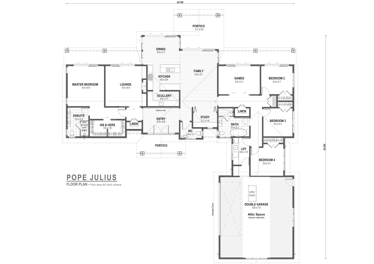 Level x 1, Size 307m2, Living x 3, Bedrooms x 4, Study, Bathroom x 2 plus separate toilet, Scullery, Attic space, Car x 2.5